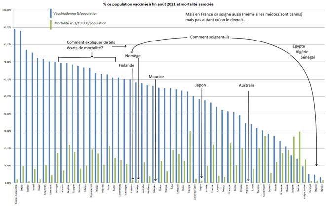 Comment justifier la mise en place d’un pass sanitaire quand la vaccination ne fait pas la preuve de son efficacité. Les pays qui ne vaccinent que les volontaires et qui soignent les autres ont un taux de mortalité moindre.